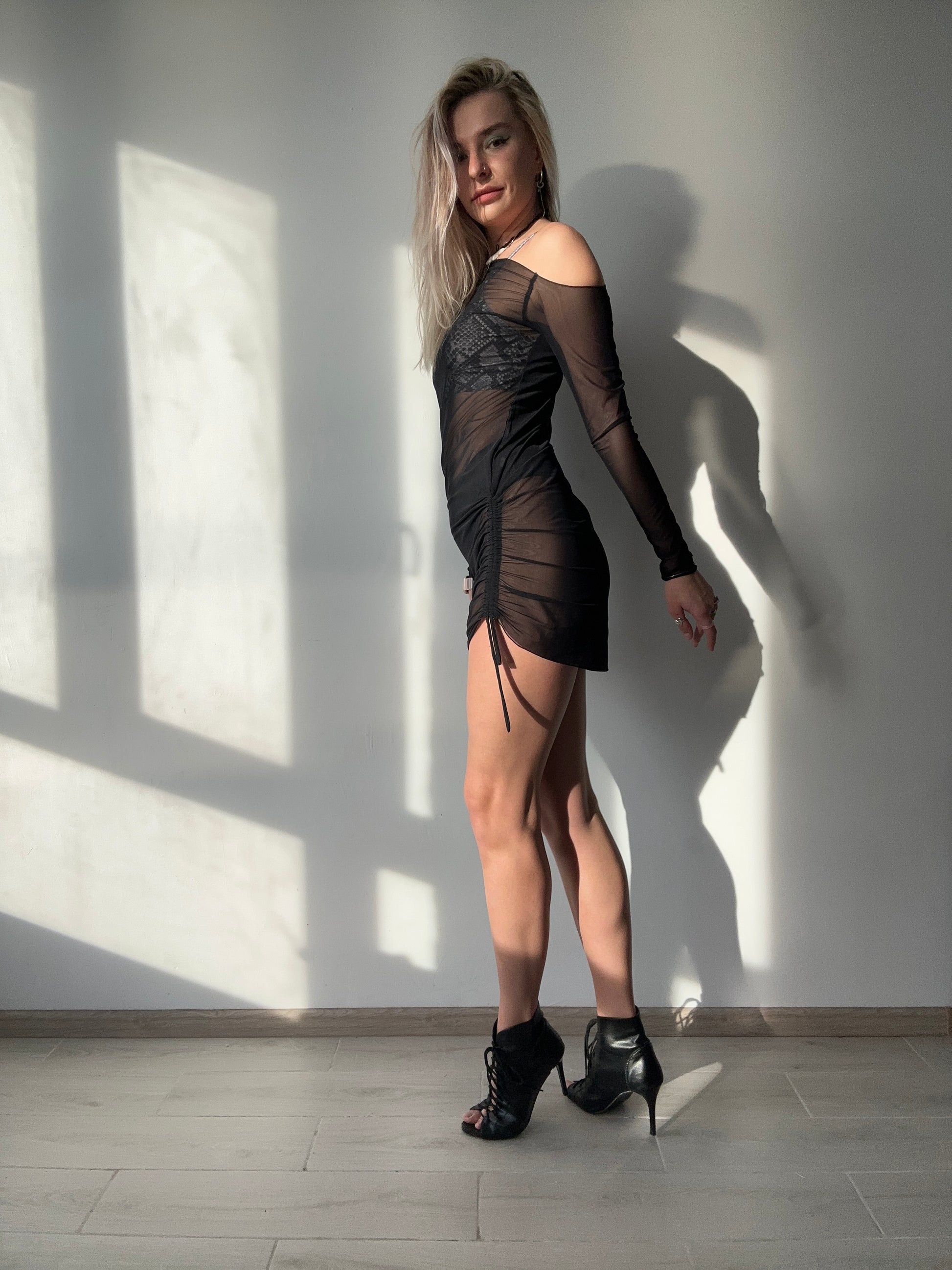 Black asymmetric mesh mini dress — bold, sheer and designed for statement dance looks. Featuring a fishnet-inspired design with an uneven cut, this dress combines allure with comfort. The breathable mesh fabric and mini length create a daring silhouette that’s perfect for nightlife, stage wear and festivals.