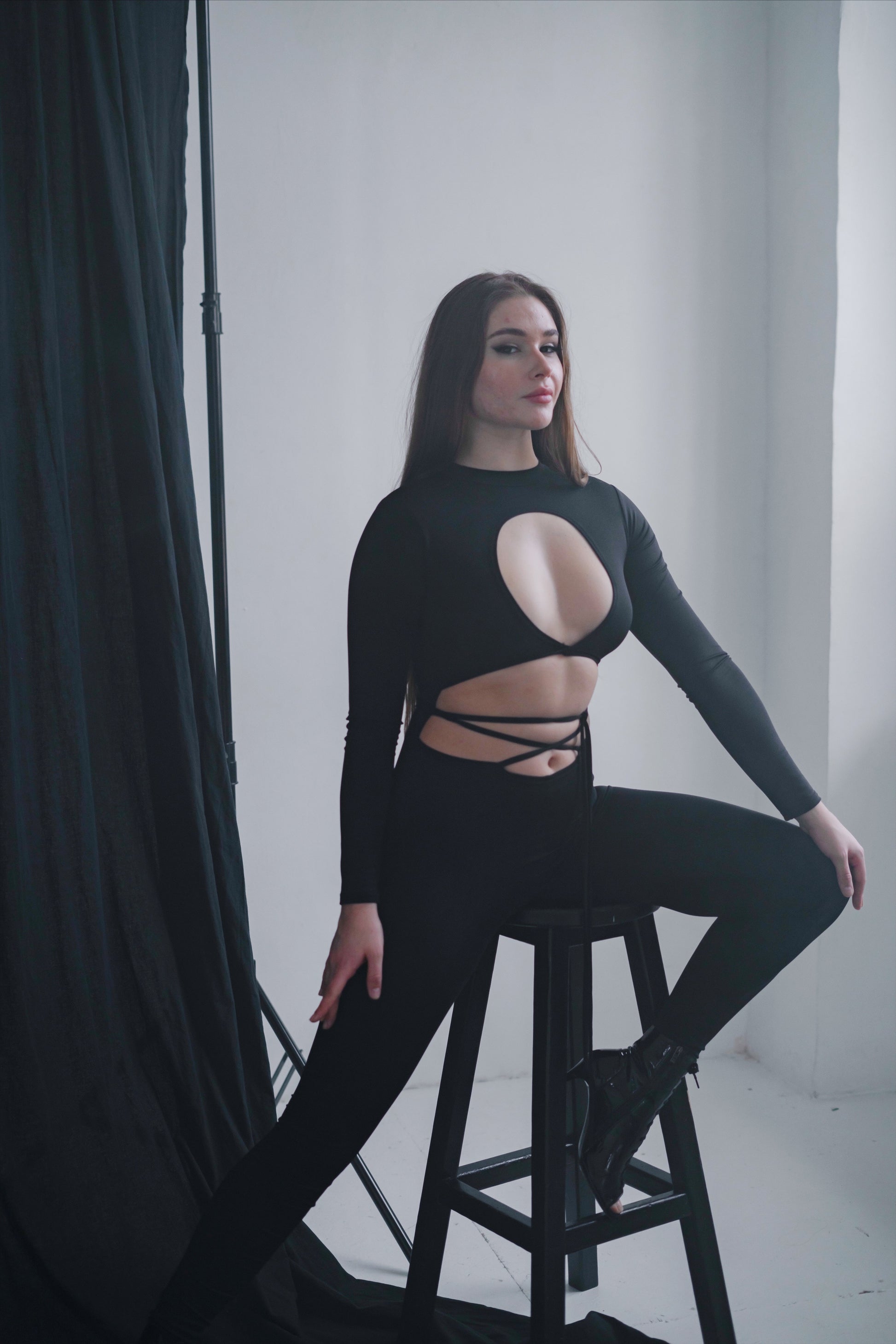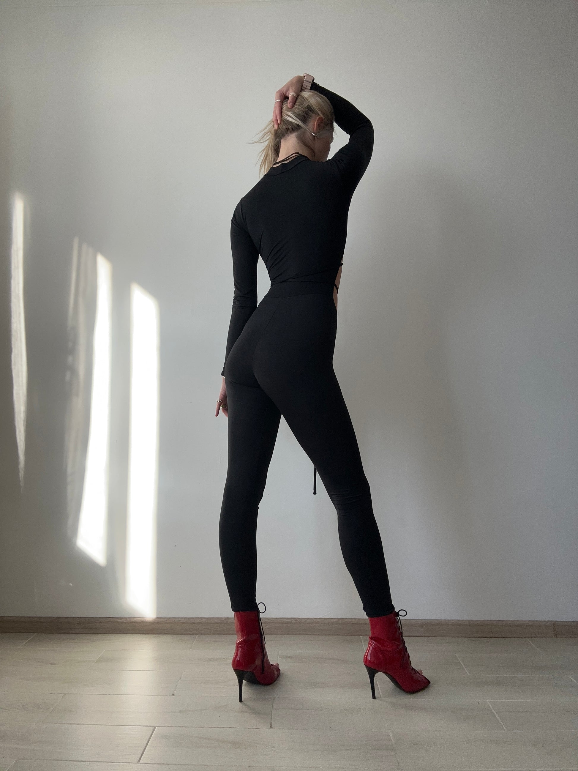 Black cutout jumpsuit with long ties — daring, sleek and versatile. Crafted from soft stretchy fabric, this slim-fit one-piece features bold cutouts at the belly and neckline, creating a striking silhouette. The extra-long ties add a playful, transformable detail — wrap them around your waist, cross them as straps, or leave them loose for dramatic movement. A statement outfit for stage, club or festival looks.