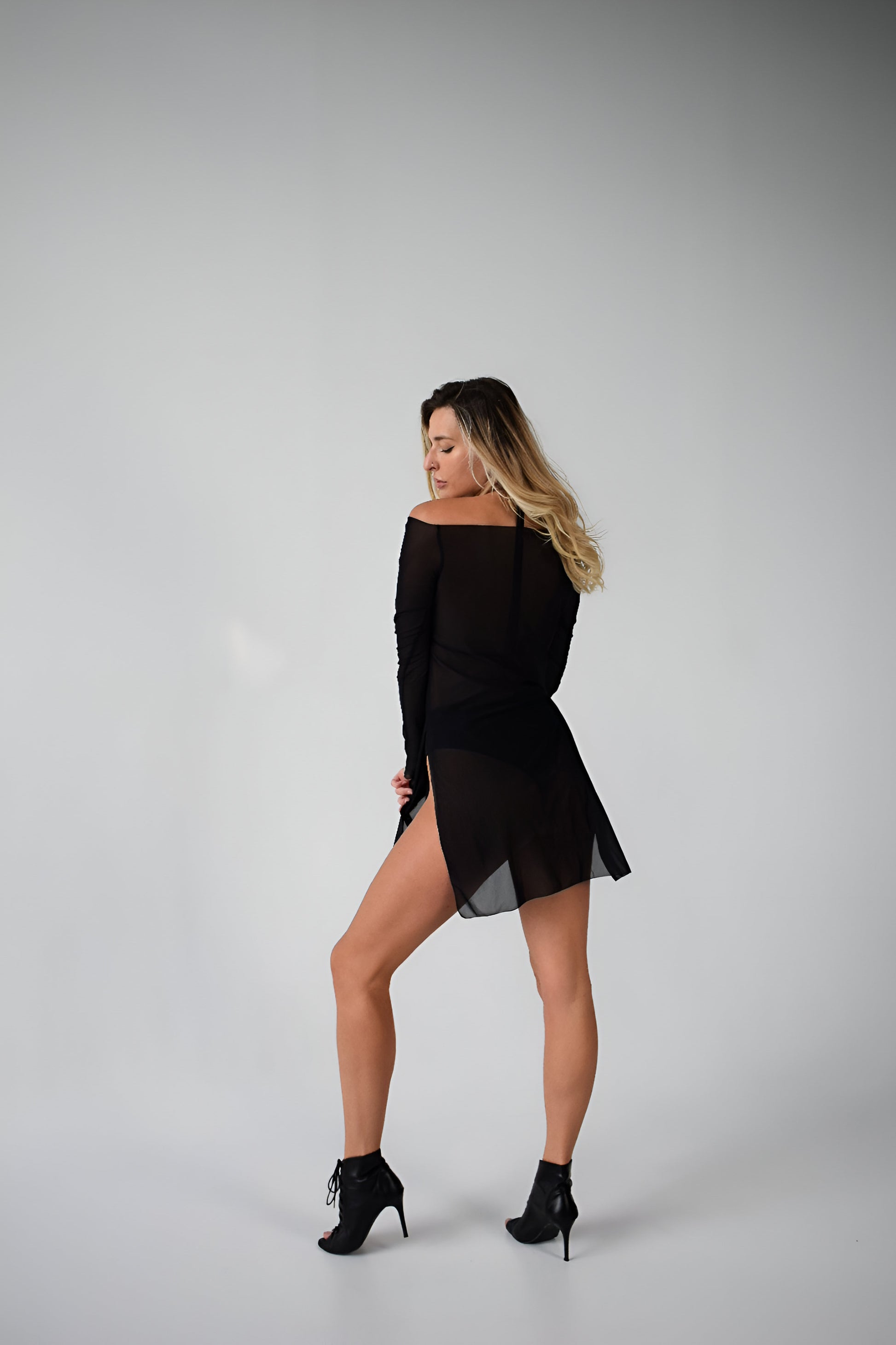 Black mesh/fishnet mini dress — daring, sheer and designed to stand out. This lightweight mesh piece features a bold see-through design that combines elegance with playfulness. The mini length and breathable fabric make it perfect for active dancing, nightlife or layering over lingerie. A versatile outfit for both stage performances and festivals.