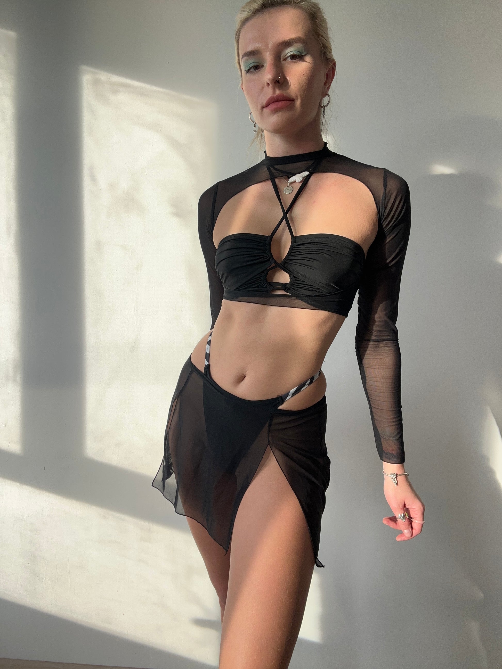 • Black mesh stappy top: https://bvrly-heels.com/products/black-mesh-strappy-crop-top