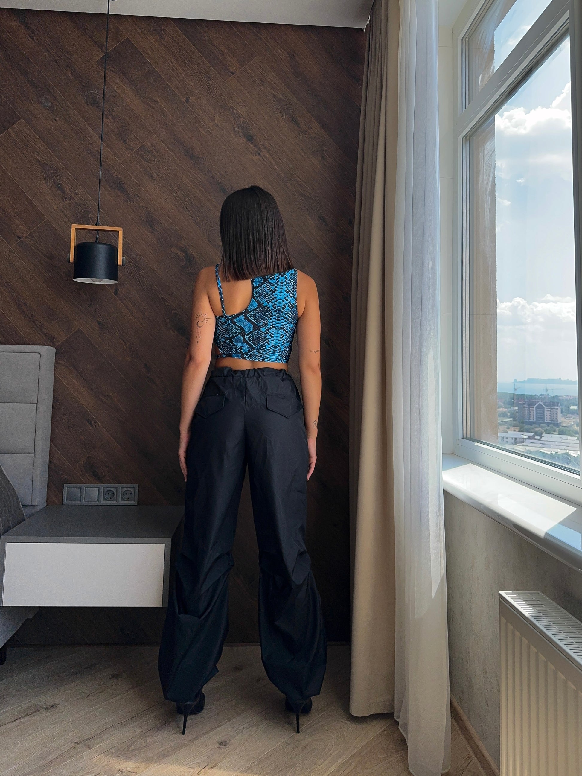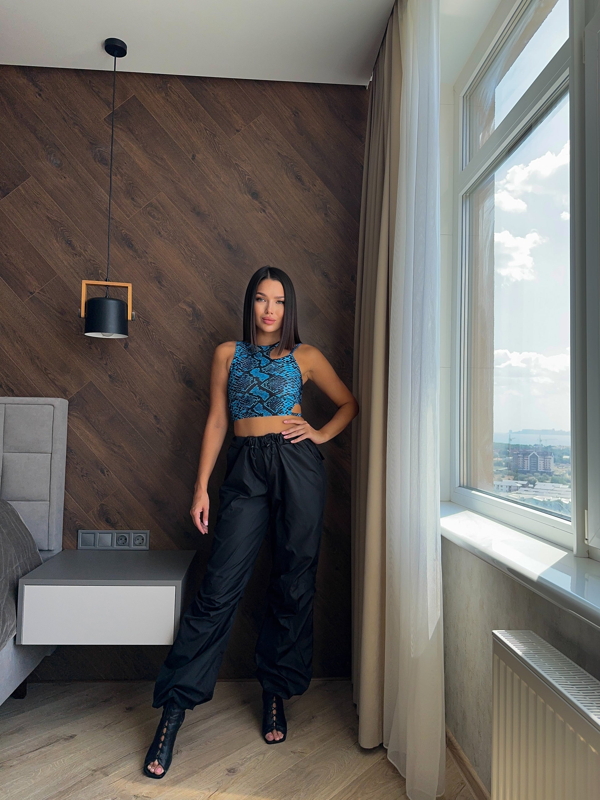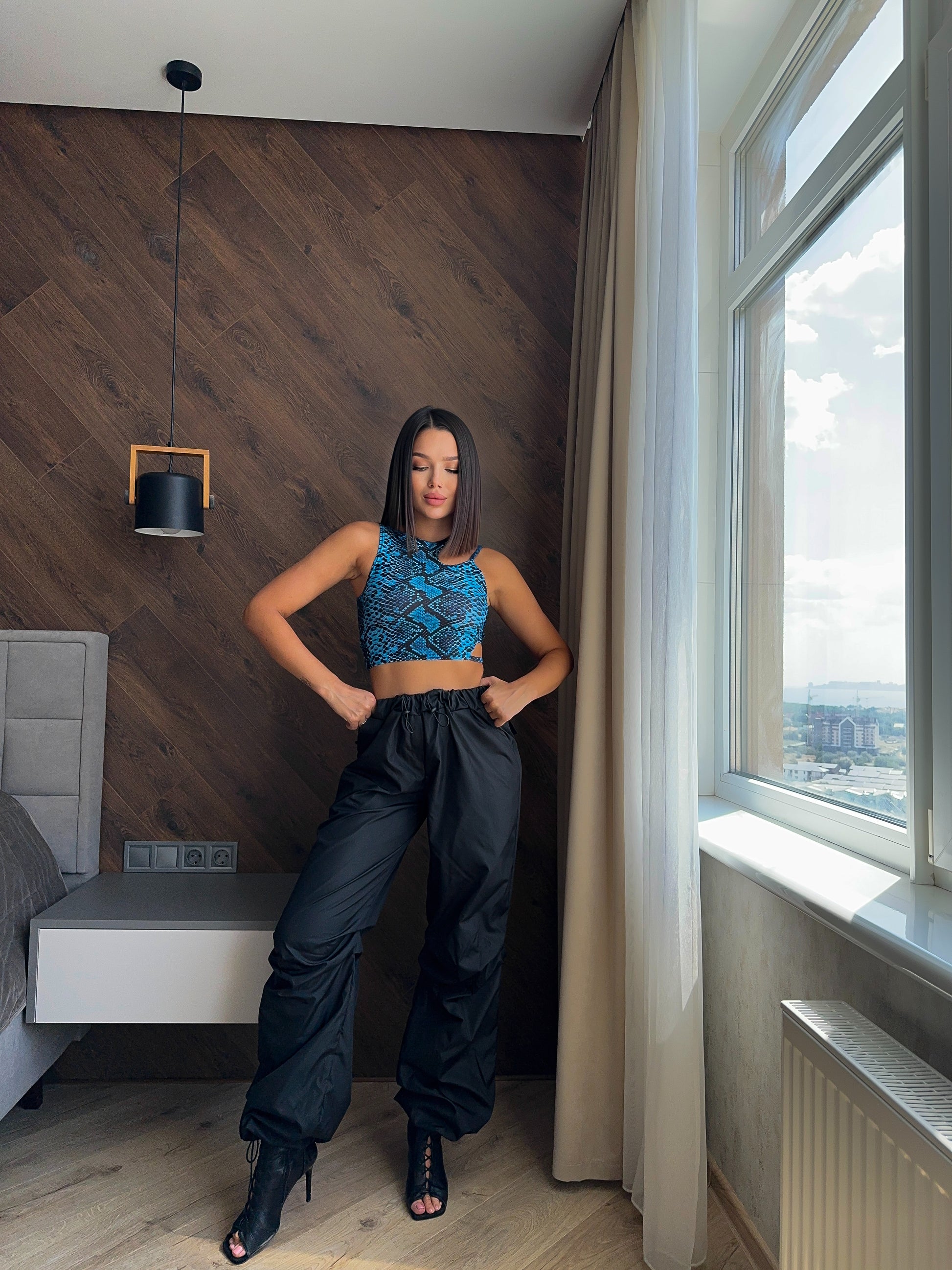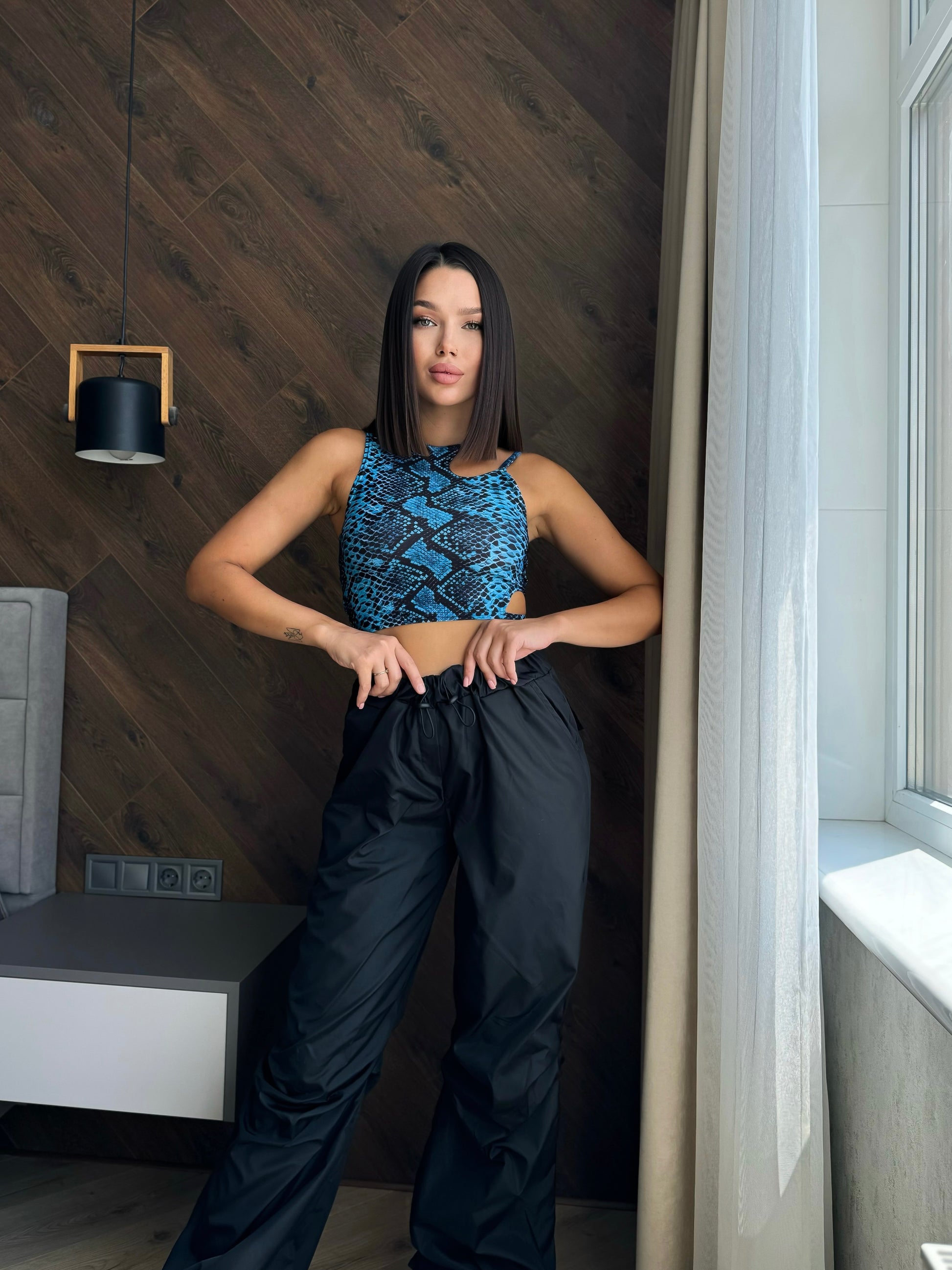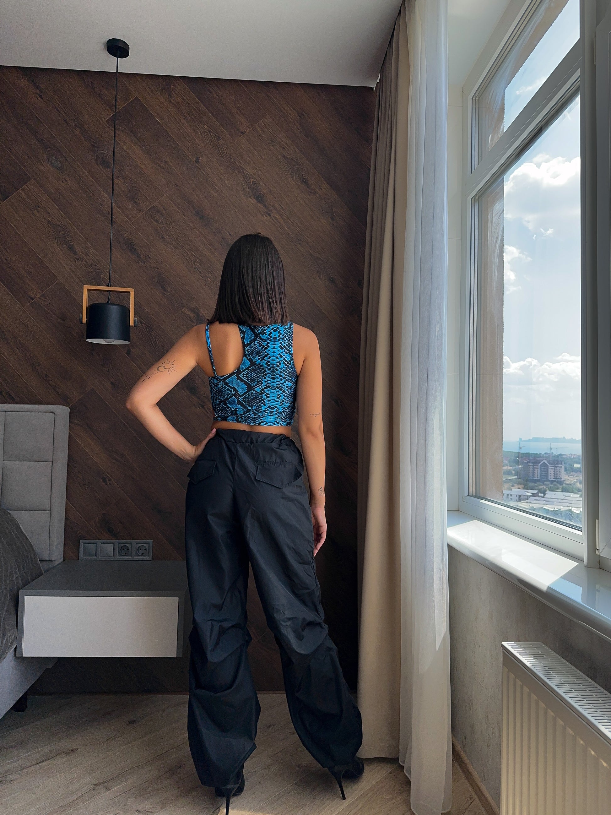 This sleeveless dance top features a striking blue python (snake) print with a clean, fitted silhouette. Designed for performance and movement, it hugs the body while staying comfortable and flexible. The animal print gives the top a powerful, confident vibe perfect for stage and club looks.