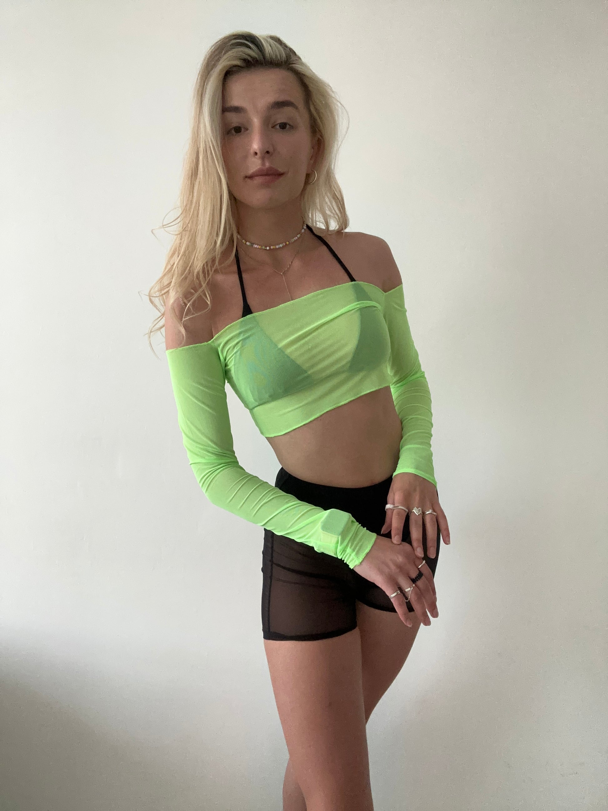 Green mesh dropped shoulder crop top — trendy, bold and versatile. Crafted from breathable stretchy fishnet, this long sleeve top combines comfort with modern style. The off-shoulder design adds allure while the cropped cut highlights your waist. Perfect for dancers and festival lovers who want to stand out.