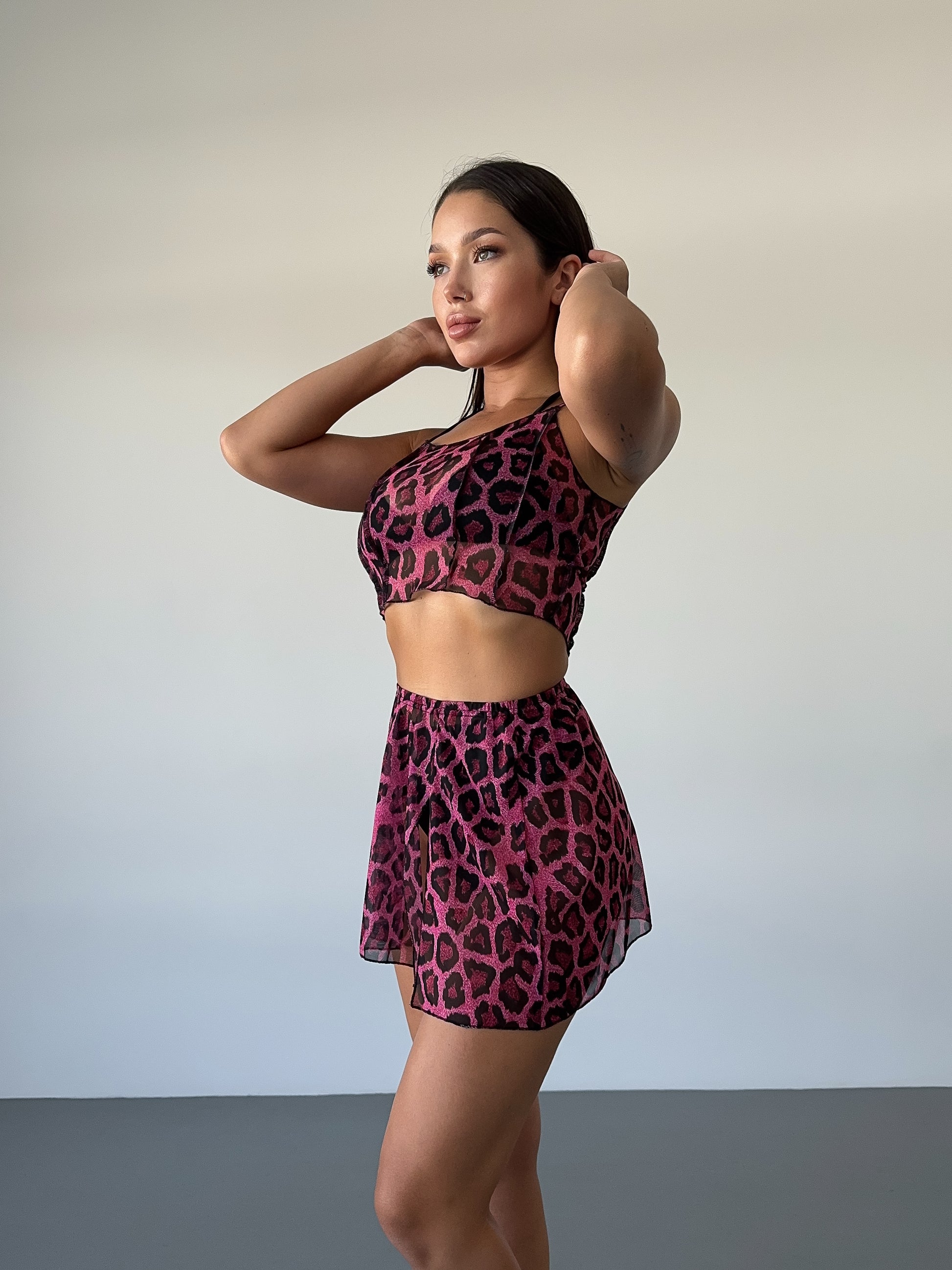 Pink crochet mesh mini skirt with leo accents — playful, sheer and designed for bold dance looks. The lightweight mesh fabric with crochet-style detailing creates texture and movement, while the mini cut keeps the look daring. Perfect for layering over panties, shorts or bodysuits, this skirt adds a fun and edgy twist to any stage or festival outfit.