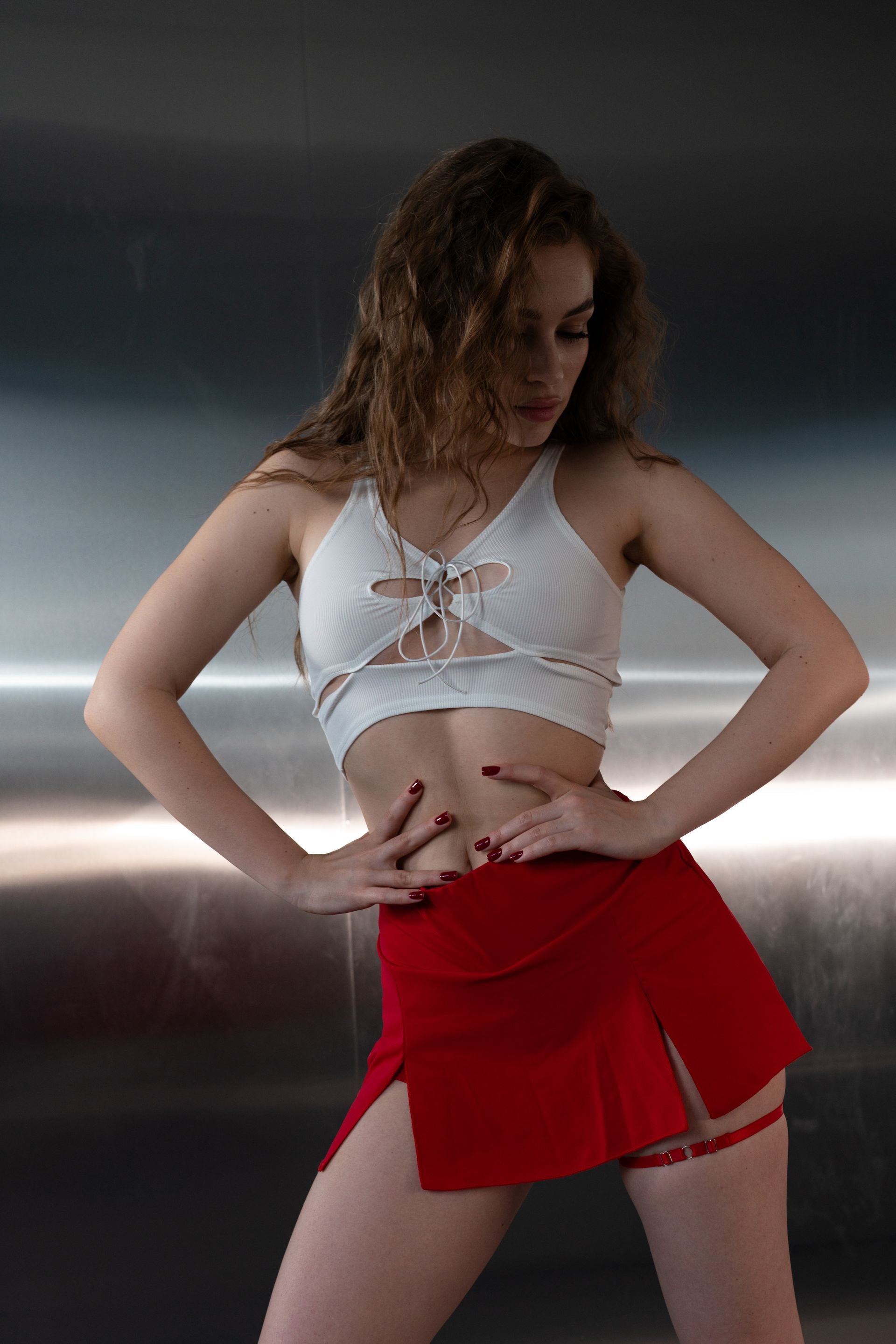 Red mini skort with red stitching — daring, stylish and made for confident movement. This versatile piece combines the bold look of a mini skirt with the comfort of fitted shorts underneath. The tone-on-tone stitching detail adds a sleek finish, while the stretchy fabric ensures comfort for dancing, performing or partying.