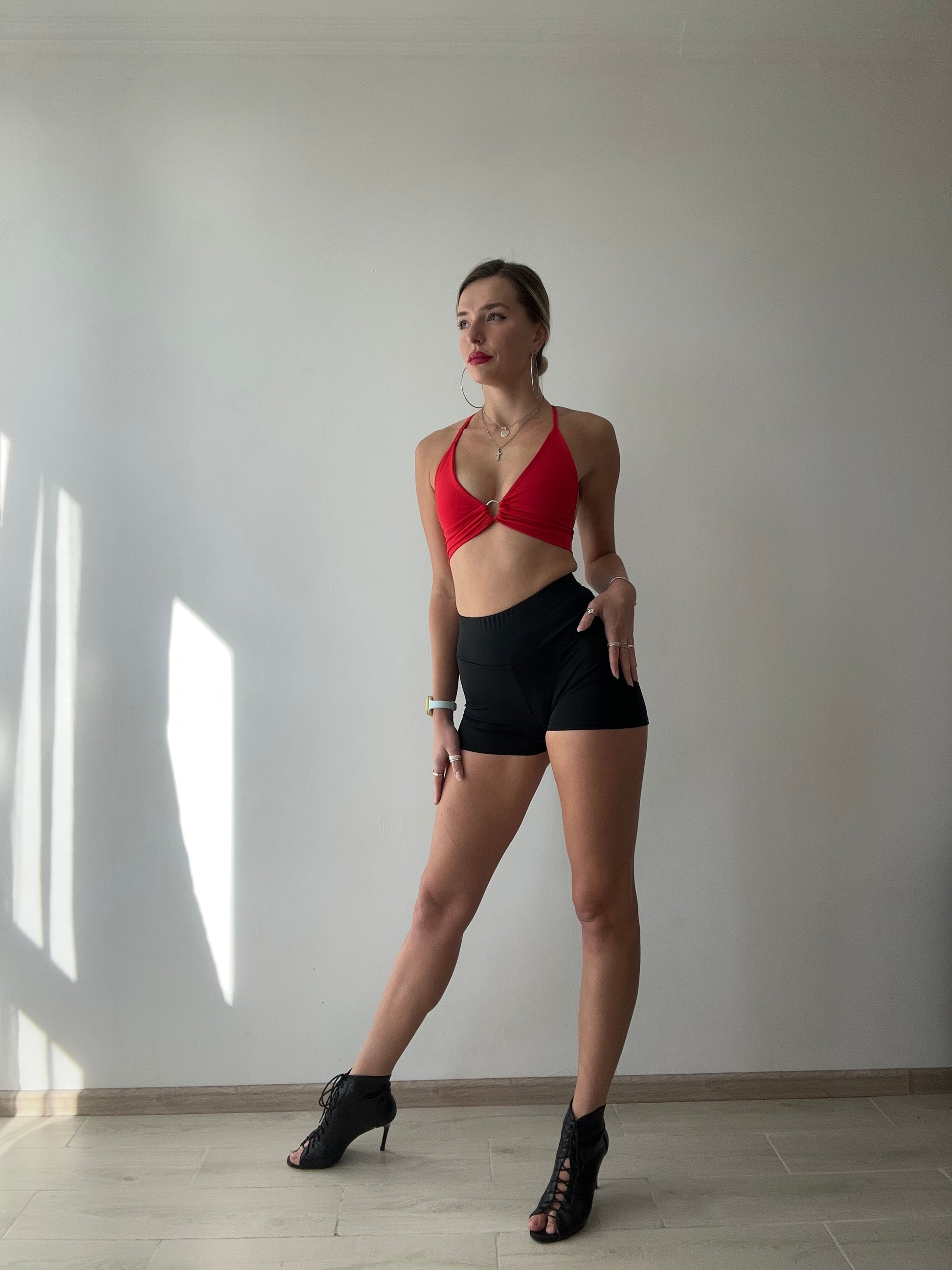 Hot Red Ring Bralette — bold, fiery and versatile. This plunge crop top with a silver ring detail and adjustable ties is crafted from soft elastic fabric to provide both comfort and style. Designed for confident movement, it works equally well as exotic dancewear, rave fashion or a daring swim bralette.