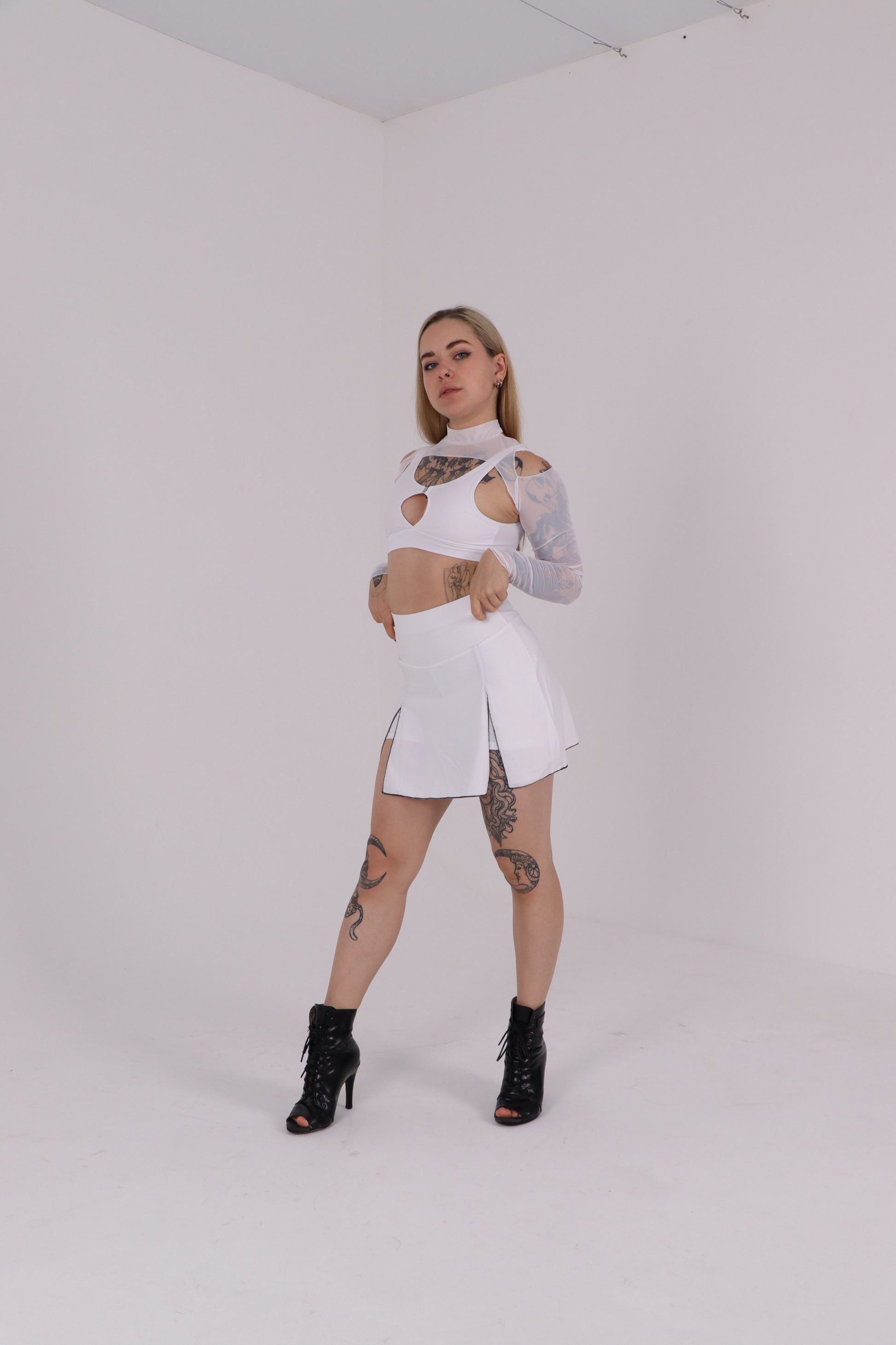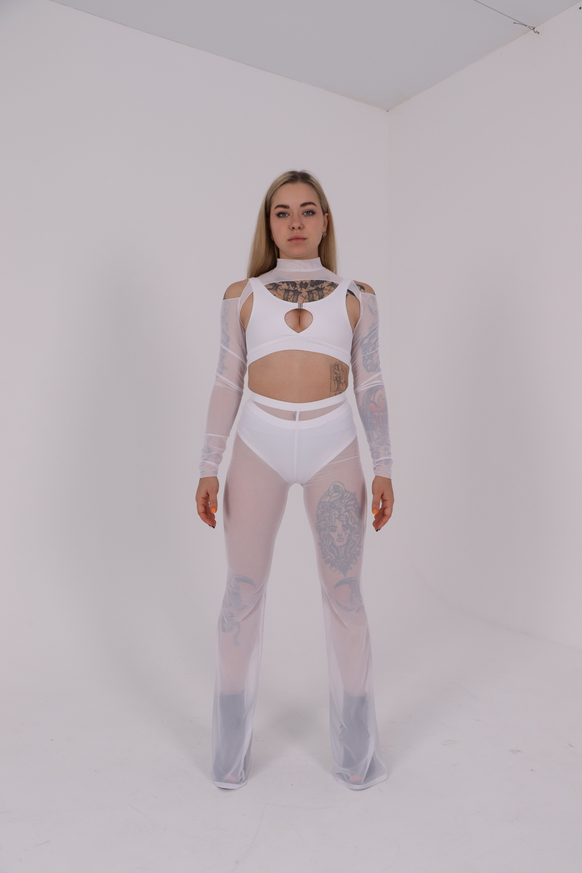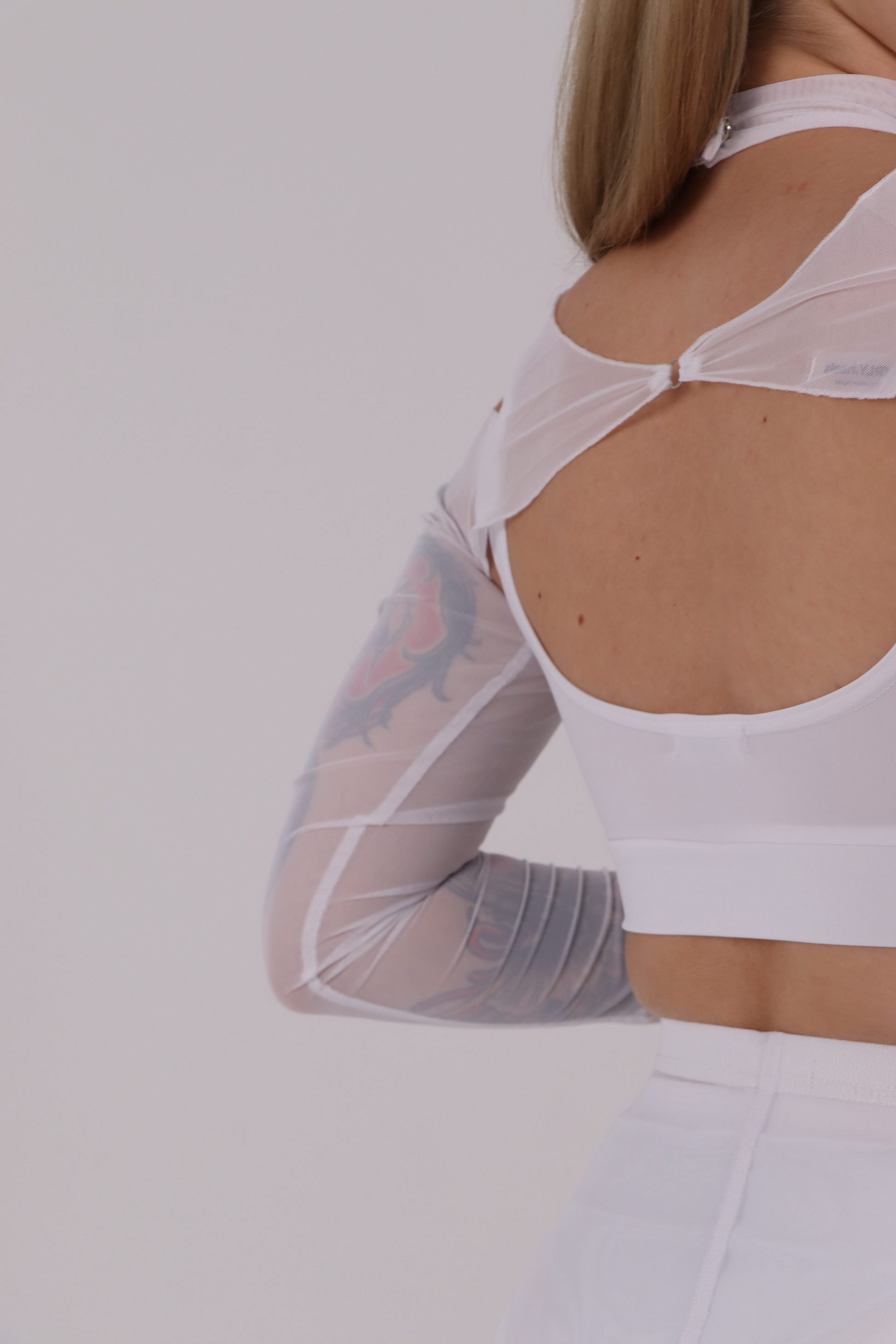 White Mesh Shrug Bolero — light, edgy and versatile. This cropped fishnet bolero with long sleeves and a faux turtleneck shoulder detail adds texture and style to any look. Designed for layering, it pairs perfectly with bralettes, bikinis or stagewear, making it a must-have for dancers, performers and festival lovers. Breathable and flexible, it moves with your body while adding a bold finishing touch.