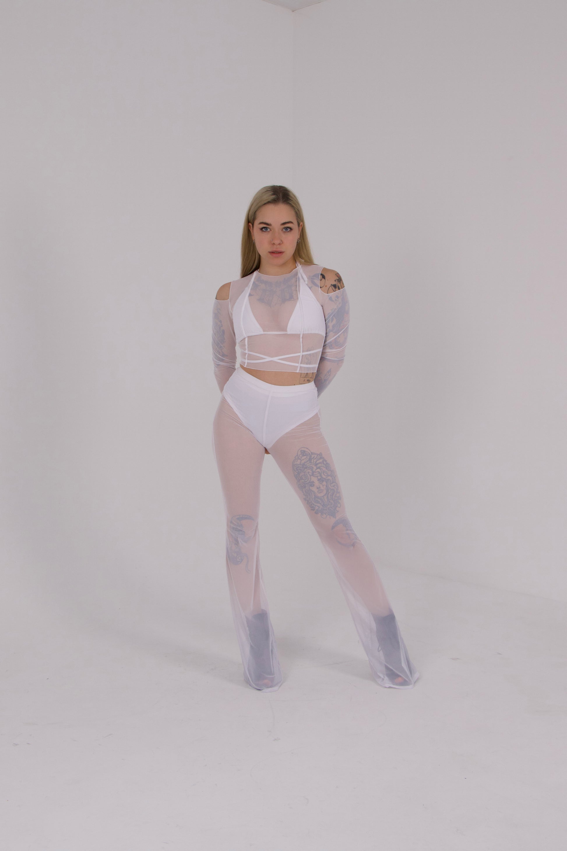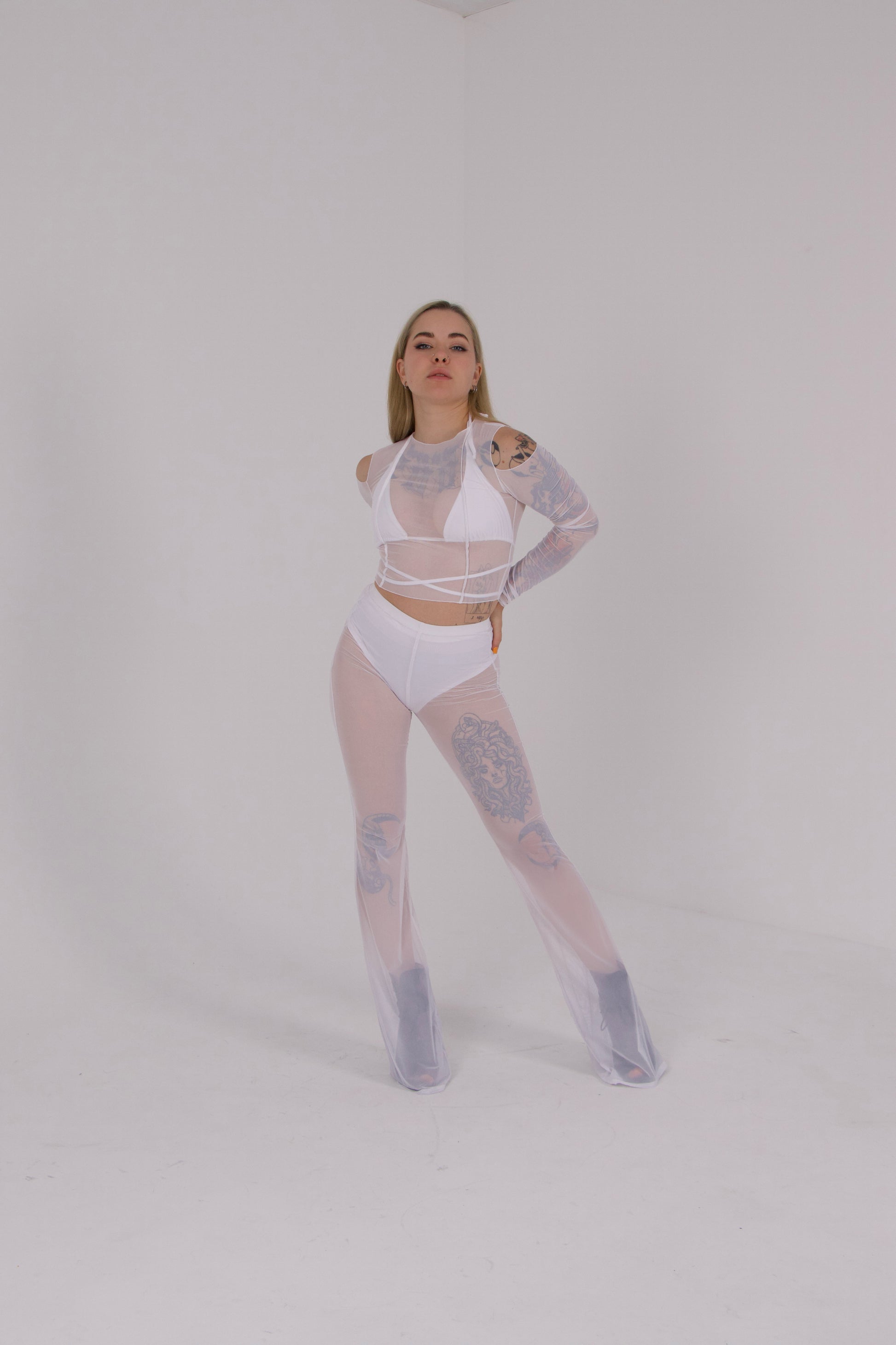 White mesh flared pants — bold, sexy and breathable. These high-waisted trousers feature a crochet-inspired fishnet design that flows into dramatic flares from the knee down. Lightweight and stretchy, they sculpt your figure while keeping you comfortable, making them ideal for festival looks, exotic stage outfits or standout club styling.