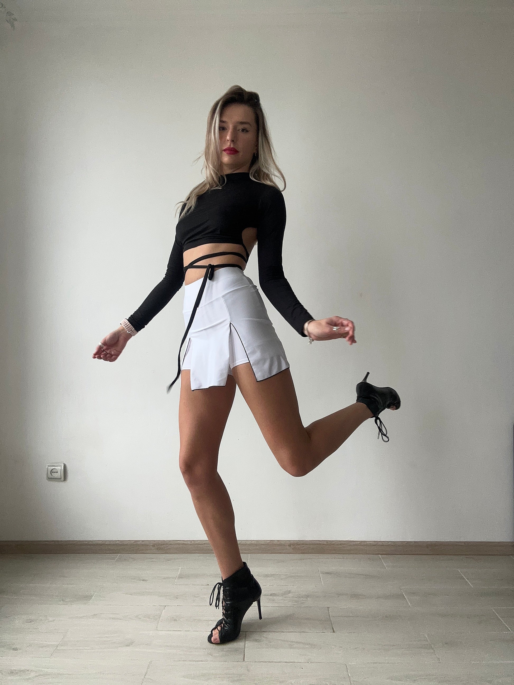 White skirt shorts with black stitching — sleek, sporty and perfect for confident movement. This versatile design looks like a mini skirt but has fitted shorts underneath for comfort and security, making it ideal for dancing, festivals or casual wear. The contrast black stitching adds a modern edge, turning this piece into a stylish must-have for bold looks.